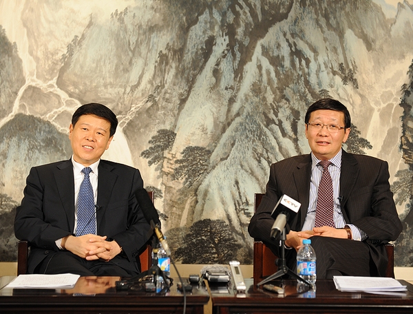 财政部大楼内,新任财政部部长楼继伟、国家税务总局局长王军16日共同接受中央媒体采访。